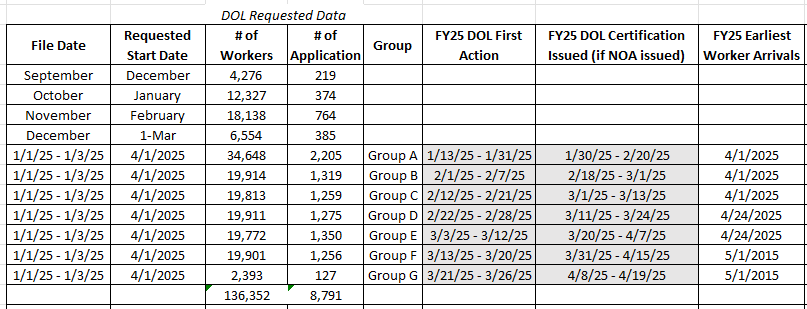 If DHS does not release the FY26 supplemental H-2B visas prior to mid-December, this will compound the already ticking time bomb at DOL. If there had not been a FY25 first half supplemental release, most of the applications for December-March start dates would have been withdrawn and resubmitted during the April 1st filing window. The chart below shows that the later groups were not certified until late-March/early-April. If an additional 1,200 applications (representing the withdrawn applications) had been added to the April 1st submissions, the later groups would not have been certified until May.
